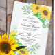 Design features a bouquet of watercolor sunflowers, eucalyptus and others leavea and twigs.
