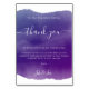 A wedding reception thank you table card features an artistic purple watercolor paint wash and elegant script, designed to greet family and friends at each meal place card setting with a warm appreciation message. Personalise the panel with the table number seating arrangement, married bride and groom names, and custom wedding thank you card wording so guests feel genuinely included. The modern layout keeps text easy to read while the soft gradient adds a refined, creative touch to reception decor.