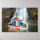 A fishing boat pictured against the backdrop of a waterfall; Quintupeu Fjord, Northern Patagonia, Chile - a beautiful corner of South America where the Andes plunge into the Pacific Ocean. [Our travel photography and designs are available as gifts for the home, cards, jigsaw puzzles, wall art and more]