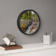 The size of the clock is dramatic and the abstract alcohol ink design is soothing and intricate at the same time. I chose the black frame that adds pop to the blue and gold design. The gold printing would be better in a slightly darker or larger font. I love it and I’m looking for just the right place in ny new apartment. I would recommend this clock for a personal gift or a present. I feel that the quality is excellent for the money! I’m a bit of a clock nut so I’m pretty particular about my purchases. The clock is larger in diameter than many if the clocks I have, so it stands out very well. I think a slightly darker printing color and a moderately larger size would best suit a professional decor or add more impact in a work place item.