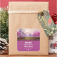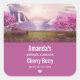 Candle or soap product stickers with a scenic image of a peaceful purple lake. Surrounded by lush cherry trees and waterfalls.
