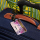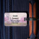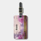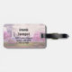 A luggage tag with a scenic image of a peaceful purple lake. Surrounded by lush cherry trees and waterfalls.