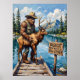 This imaginative artwork portrays Bigfoot, a gentle giant in a cowboy hat and vest, standing on a wooden dock by a tranquil lake. He is carefully carrying a young elk. The background features evergreen trees and hazy mountains under a soft sky. A weathered wooden signpost on the dock playfully declares, "BIGFOOT DOESN'T BELIEVE IN YOU EITHER". The thick, expressive brushwork creates a dreamlike quality, emphasizing the tender and slightly surreal nature of this lakeside moment.