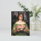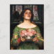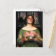 John William Waterhouse Gather Ye Rosebuds While Ye May postcard. Oil painting on canvas from 1909. Based on the Robert Herrick poem, Gather Ye Rosebuds is one of English painter John Waterhouse’s finest literary works. The painting features a beautiful girl in a green dress with gold lace and floral embroidery. The young woman holds a pewter bowl of freshly cut pink, red, and white roses in her hands. Her dark red hair is fastened with pearls, and a mirror stationed behind her reveals a stained glass window featuring a coat of arms and purple tulips. A great gift for fans of J.W. Waterhouse, Romantic English art, literary painting, and the Pre-Raphaelites.