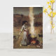 John William Waterhouse the Magic Circle greeting card. Oil painting on canvas from 1886. The Pre-Raphaelite painter John Waterhouse regularly drew from literary and mythological themes. The Magic Circle continues the artist’s fascination with the supernatural, depicting a sorceress with dark hair drawing a magic circle in the dirt with a wand. Wearing a blue dress decorated with Persian figures, she stands beside a cauldron smoking above the orange and red embers of a glowing fire. Black ravens stand nearby watching the ritual unfold. A great gift for fans of J.W. Waterhouse, the Pre-Raphaelites, magic, sorcery, and English Romantic painting.