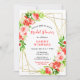 This fun and whimsical bridal shower invitation features watercolor watermelon, pomegranate, strawberries, cherries and foliage on a gold geometric frame. The text combines handwritten script and serif fonts for a stylish and modern look. This is perfect for a summer rustic bridal shower.