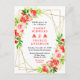 This fun and whimsical wedding postcard features watercolor watermelon, pomegranate, strawberries, cherries and foliage on a gold geometric frame. The text combines handwritten script and serif fonts for a stylish and modern look. This is perfect for a summer rustic wedding.
