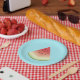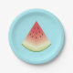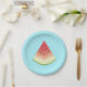 Illustration of a cartoon watermelon slice on a blue background colour. Perfect for those summer picnics, for example!