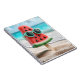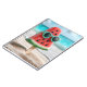 A watermelon popsicle wearing sunglasses stands in the beach sand.