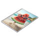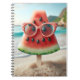 A watermelon popsicle wearing sunglasses stands in the beach sand.