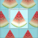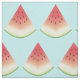 This fabric features a pattern of cartoon watermelon slices on a blue background colour.