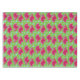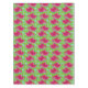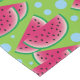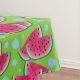 This table cloth features a fun, summer pattern of watermelon slices. The background is bright green and is accented with light blue dots.