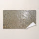 Bath towel set features an original photograph of rocks and pebbles at the water's edge, along a sandy beach.
