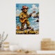 This imaginative artwork showcases a bear, a true "Bear of the Sea," with a firefighter helmet and sunglasses, captivatingly playing an acoustic guitar on a rocky outcrop at the edge of the ocean. Crashing waves and a blue sky with scattered clouds form the backdrop. The vibrant, textured impasto creates a powerful and whimsical atmosphere, making this "Love My Honey" scene truly unforgettable.
