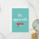 A casual "We appreciate you" card. Red and white script on light teal appreciation card that you can make personal with a nice gesture from the company boss, co-workers or anyone. Just use the "personalise this template" feature to edit the text to make it your own. Other paper styles available.