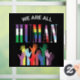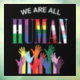 Social justice themed  window cling design features multi-colour "We are all human" text and hands representing the LGBTQ community