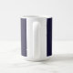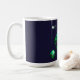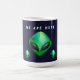 Cool fun coffee mug with a printed image of 3/three green alien heads on a very dark blue background, with a caption/phrase which reads "WE ARE HERE"