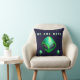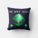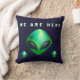 Cool fun cushion with a printed image of 3/three green alien heads on a very dark blue background, with a caption/phrase which reads "WE ARE HERE"