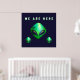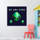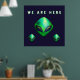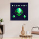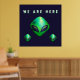 Cool fun poster with a printed image of 3/three green alien heads on a very dark blue background, with a caption/phrase which reads "WE ARE HERE"