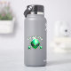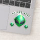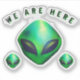 Cool fun sticker/lable with a printed image of 3/three green alien heads on a very dark blue background, with a caption/phrase which reads "WE ARE HERE"