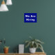 A modern blue poster for a store window notifying the public that you are hiring new staff.
