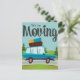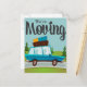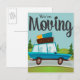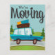 Make sure everyone knows your new address when you move. Cartoon car with suitcases on top. Pine trees in the background. "We're Moving" above