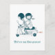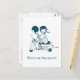 Original illustration of two young people in love riding a vespa. He is the driver and she is sitting behind him, holding him around his waist. Instead of gas coming out of the motorcycle, there are little red love hearts, the same colour as the cheeks of both vespa riders. Below is customisable text saying: "We're on the move!"