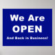 A simple yet bold blue poster that is suitable for business purposes that states, “WE ARE OPEN and back in business” to be displayed for a business, organization or group that has been temporarily closed. A great way to let everyone know that you are open and back in business. Displaying it in your store window is an option.