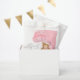 Celebrate the coming of your bundle of joy with these adorable we can barely wait snowy pink winter Christmas baby shower favour bags featuring a sleepy bear wearing a baby pink santa hat and bow holding balloons sitting on a sparkly cloud.