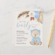 Boho budget-friendly baby boy shower invitation featuring a watercolor of a cute teddy bear, a bouquet of taupe, blue and terracotta pampas grass and florals and "We Can Bearly Wait" in a mix of simple typography and a stylish blue swash script.