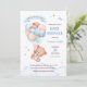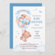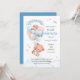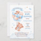 This cute Baby Shower invitation has the theme "We can bearly wait". It features a soft illustration of a happy baby teddy bear floating with balloons. Other cute elements such as stars, a little bird, and clouds complete this cosy design. The blue and brown colour palette is perfect for a mum-to-be expecting a baby boy.