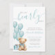 "We can BEARly wait" sets the tone for this adorable baby shower invitation, perfect for celebrating the mother to be and her baby boy. Featuring blue watercolor balloons, a cute tan teddy bear with blue accents on the bow and gift box, this design is as charming as it is sweet. The fonts are a mix of elegant script calligraphy and classic serif, creating a stylish and balanced look. The current font colours are blue and grey, but you can customise them, along with the background, to match your theme. This versatile invitation works year-round, adding a touch of playful elegance to any baby shower celebration. The watercolor elements and cute bear make it a delightful choice for honouring the mother to be on her special day. Cute Watercolor We Can Bearly Wait Boy Baby Shower Invitation With Blue Balloons & Teddy Bear.