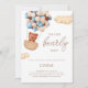 Adorable boy baby shower invitation with an illustration of a bear in a basket, going away in balloons. Great for baby boy celebration or even gender neutral. Illustrated and designed by Patricia Alvarez.