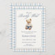 This blue gingham teddy bear baby shower invitation features a classic storybook-style teddy bear dressed in a soft blue outfit, framed by a timeless blue and beige gingham border. The elegant script “We Can Bearly Wait” creates a calm, traditional feel perfect for welcoming a baby boy.