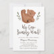 Cute bear theme baby shower featuring hand painted illustration of a cub with greenery leaves. The text says "we can bearly wait!" This invitation is great for a gender neutral shower in the fall.
