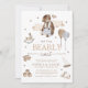 Celebrate the upcoming arrival with this "We Can Bearly Wait" Boy Baby Shower Invitations, a charming ode to woodland wonders and cuddly bears. Crafted with rustic charm, this invitation features an adorable bear cub motif in warm, earthy tones of brown. The cute teddy bear illustration adds a delightful touch, setting the perfect tone for a cosy and heartwarming celebration. Embrace the joyous anticipation with this endearing design, ideal for welcoming the little one into the world. Share the excitement in style, inviting loved ones to join the adventure of the baby shower, filled with bear-themed sweetness and joy.