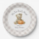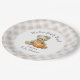 A cute baby shower paper plate trimmed in neutral beige gingham with a baby girl teddy bear popular theme - "We Can Bearly Wait!". An adorable girl teddy bear with bow in her hair sits with an autumn pumpkin. A whimsical font spells out the shower theme along with the Mummy-to-Be's name that you can personalise with your guest of honour's name.