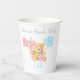 Cute and modern and trendy gender reveal party cup featuring a watercolor illustration of a teddy bear in watercolor with pink and blue balloons and a bow tie The text says "We can nearly wait... He or She?" Perfect for a gender reveal party