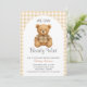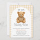A rustic themed baby shower "We Can Bearly Wait" featuring cute preppy bear wearing luxury designer plaid outfit in brown, beige colours and gingham background. You can easily personalise this with your details.