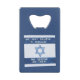 A hand-painted, blue-on-white, sign posted outside a shop in the Israeli town of Rosh Pina. The sign has English-language text reading, WE DON'T BELIEVE IN MIRACLES, WE DEPEND ON THEM" on a representation of Israel's flag. The national flag of Israel also appears on the reverse side.