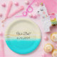 Ocean shore, teal water, sandy beach, paper plates perfect for a beach themed wedding or baby shower. The text says, "We Did," and you can edit the date.