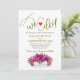 These beautiful wedding invitations feature a beautiful design with a bouquet of tropical flowers and greenery tied with a white satin bow. The vibrant hot pink, magenta, fuchsia, and yellow blooms include hibiscus and bird of paradise. The elegant gold script lettering reads "We Do!" with a hot pink coloured heart between the words. Whimsical, cute, and fun, these invitations are perfect for destination weddings in exotic locations, or for anyone who wants a bright colourful invite!