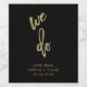 These simple, elegant wedding wine bottle labels feature edgy modern faux gold handwritten script typography that says "we do", on a black background.