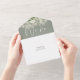 All-in-one sage green wedding invitation featuring pretty string lights, floral greenery, rustic leaves and elegant typography. The invitation includes a perforated RSVP card that can be individually addressed or left blank for you to handwrite your guest's address details. Designed by Thisisnotme©