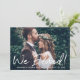 Announce your elopement in style with this brush script photo wedding announcement. A bold "We Eloped!" headline in white brushstroke lettering overlays your favourite photo on the front, with names and date beneath. The back features a second photo alongside a customisable letter sharing the story of your private ceremony. Replace the photos and edit all text to make it completely your own.
