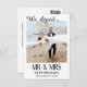 This simple and stylish elopement announcement card is customisable with one of your favourite wedding photos on the front, with the captions "We eloped" in trendy, black handwritten script, and MR & MRS in a modern all-caps font, customisable with your name and wedding date.