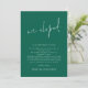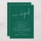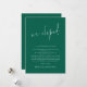 Minimalist We Eloped Script Emerald Green Elopement Announcement. Available printed and digitally. With a QR code to a page where your guests can see your wedding photos on the back. Your QR code will be automatically generated to update the sample code in the design, when you simply change the sample URL in the template with your own URL. Or you can remove this if not required. A set informal script for We Eloped and the rest of the text you can easily personalise.