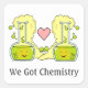 Two cute happy chemistry flasks with green fluid bubbling out the top facing each other with happy smiling faces and a pink love heart between them. Below are the words we got chemistry in grey lettering.