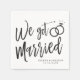 A fun and unique script lettered napkin tailored specifically to you a post-nuptial party.  It features the words "We Got Married" with wedding rings resting over it. Underneath this and above it are the names of the bride and groom and the engagement date.