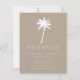 Tropical moving announcement featuring a palm tree set on a brown background with a fresh & modern stripe back.